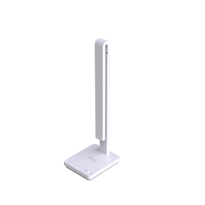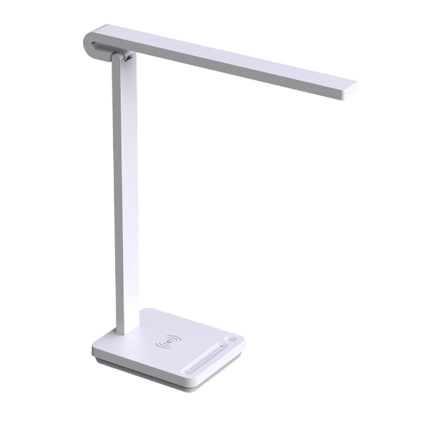 Lámpara de escritorio LED con carga wireless y puerto USB. Con cabezal orientable, intensidad de luz variable, color blanco